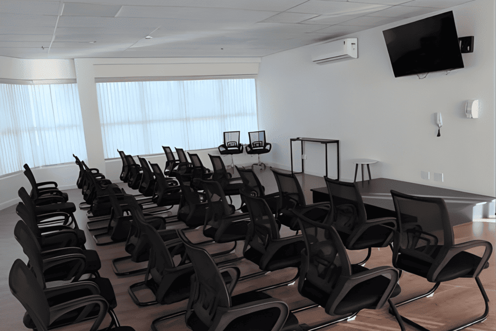Auditório em Santos, perfeito para palestras, treinamentos e eventos corporativos. Capacidade para até 60 pessoas, com monitor, recursos para apresentações e coffee-break opcional.