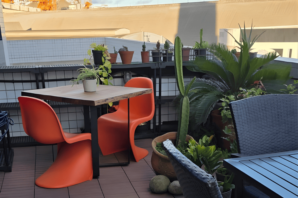 Varanda aconchegante e agradável para relaxar com calma durante a pausa do café, oferecendo conforto, leveza e um momento de descanso no dia tranquilo.